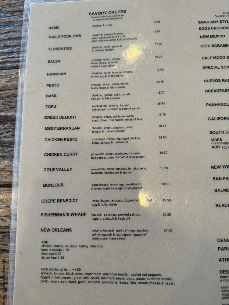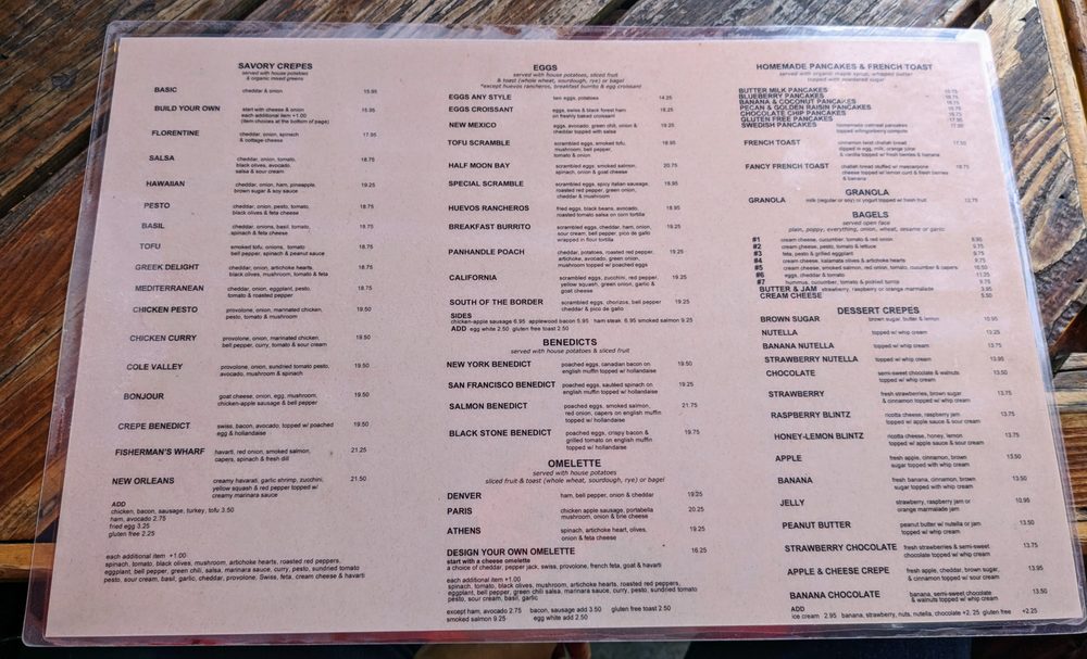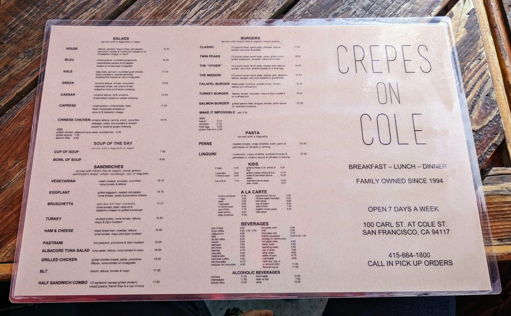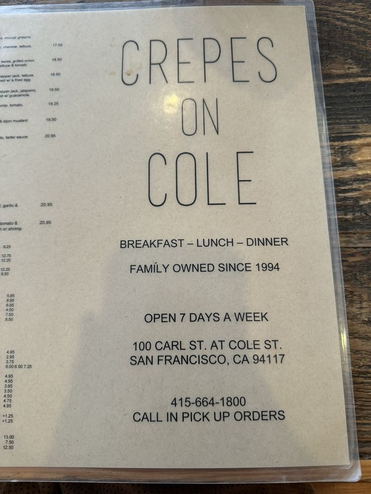 Welcome to Crepes On Cole, a charming restaurant located in San Francisco's Cole Valley neighborhood. This cozy spot offers a wide variety of crepes, eggs, and benedicts for breakfast, brunch, and lunch. With options like the Basic Crepe with cheddar and onion, or the flavorful Salsa Crepe with avocado and sour cream, there's something for everyone to enjoy. The relaxing ambiance and attentive service make dining here a pleasant experience. Customers rave about the Nutella crepe and fluffy pancakes, showcasing the diversity and quality of the menu. Whether you're looking for a casual meal or a special occasion, Crepes On Cole is a must-visit destination for delicious and satisfying meals. So, come by and indulge in their delectable offerings today!