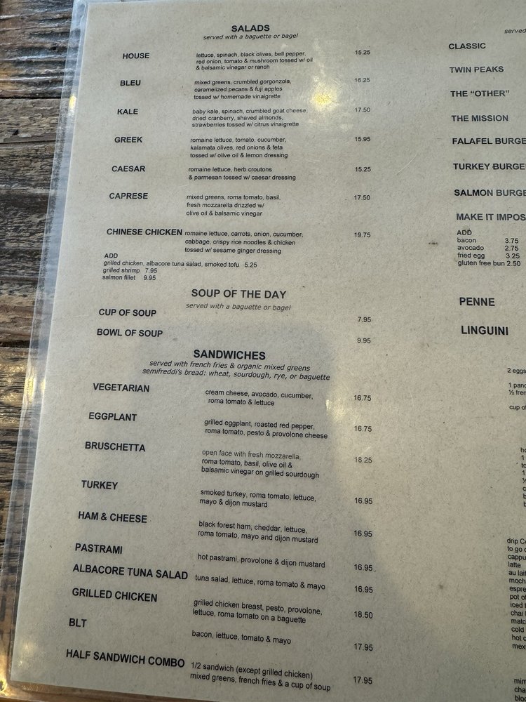 1/2 sandwich (except grilled chicken) mixed greens, French fries & a cup of soup.